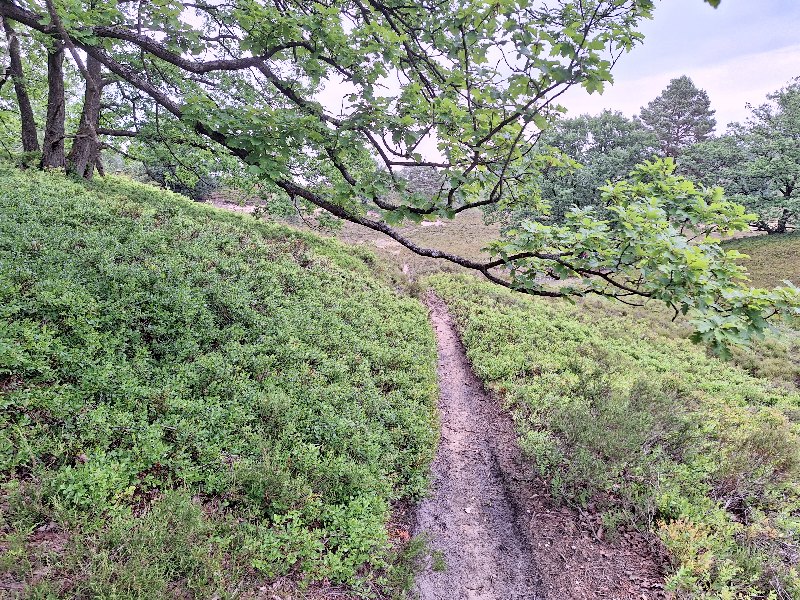 Jetzt geht es einen Single-Trail durch die Heide entlang. Nach ca. KM 4,16 erreichen wir eine Kreuzung mit einem großen Stein (da steht etwas mit "Jesus" drauf). An dieser Kreuzung laufen wir geradeaus den schmalen Pfad weiter entlang und lassen den Stein links von uns liegen.