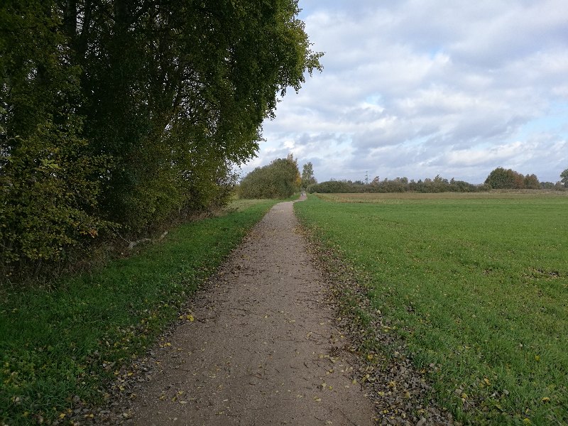 Am Start/Ziel geht es nun in östliche Richtung vorbei am Bahnhof und den asphaltierten Weg entlang bis zum großen grünen Tor. Dieses Tor ist zu durchqueren und gleich dahinter geht es nach links in einen befestigten Sandweg zwischen den Weiden hindurch. Nach kurzer Zeit führt der Weg durch ein kleines Wäldchen. Dahinter folgt eine T-Kreuzung. Hier ist links abzubiegen (geradeaus steht derzeit auch ein Hinweis, dass der Weg nicht weiter führt). Den soeben links abgebogenen Weg laufen wir bis zum Ende, wo dieser auf die B3 neu stößt. Hier an der Markierung wird gewendet und der Weg wie gekommen, zurückgelaufen.