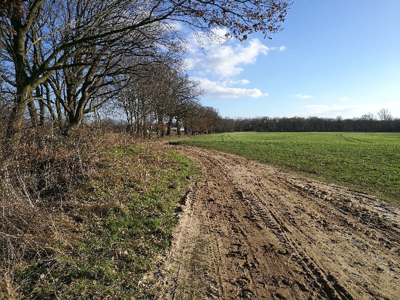Die Strecke: Rundkurs mit einer Länge von 6.182 Metern je Runde (Vermessen am 27.02.2022 mit Messrad Geotec M10 mit Umdrehungszähler Typ Hengstler 225), welcher sieben Mal zu durchlaufen ist. Sehr flache Strecke mit insgesamt etwa nur 35 Höhenmetern. Unterschiedliche Untergründe, vorwiegend Sandwege und befestigte Wirtschaftswege. Bei feuchter Witterung an den vorherigen Tagen ist allerdings mit recht schlammigen Untergrund (siehe Bild oben) zu rechnen. Die Strecke hat fünf Abbiegungen (links, rechts, links, links und nochmal links) und wird an diesen gekennzeichnet sein.